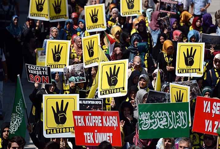 "Zalimler için yaşasın cehennem", "Esmaların kanları zalimleri boğacak", "İnsanlık uyuma mazlumlara sahip çık", "Seyyid Kutup, El Benna selam olsun İhvan'a" sloganları atan ve Rabia işareti yapan gruptakiler adına Genç Memur-Sen Genel Başkanı Eyüp Beyhan, ortak bildiriyi okudu.