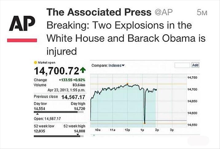 Associated Press (AP) haber ajansının sosyal paylaşım sitesi Twitter'daki hesabını ele geçiren bilgisayar korsanlarının "Beyaz Saray'a saldırı, Başkan Obama yaralandı" mesajının, Dow Jones Sanayi Endeksi'nin 150 puan düşmesine neden olduğu bildirildi.