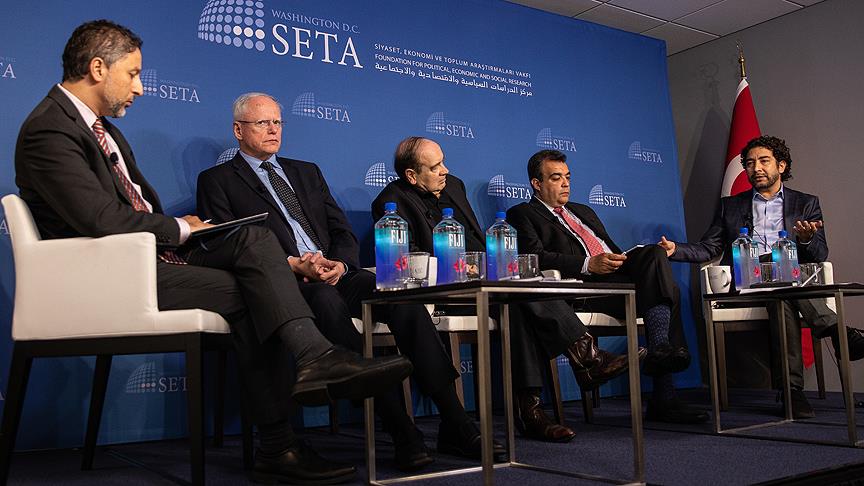 Siyaset Ekonomi ve Toplum Araştırmaları Vakfı Washington Ofisinin (SETA DC) düzenlediği "Münbiç Anlaşması: Türk Amerikan İlişkilerinin Geleceği" başlıklı panele ABD'nin eski Ankara Büyükelçisi James Jeffrey, dış politika analisti Mark Perry, SETA DC Araştırma Direktörü Kılıç Buğra Kanat ve People Demand Change adlı kuruluşun direktörü Bassam Barabandi konuşmacı olarak katıldı.