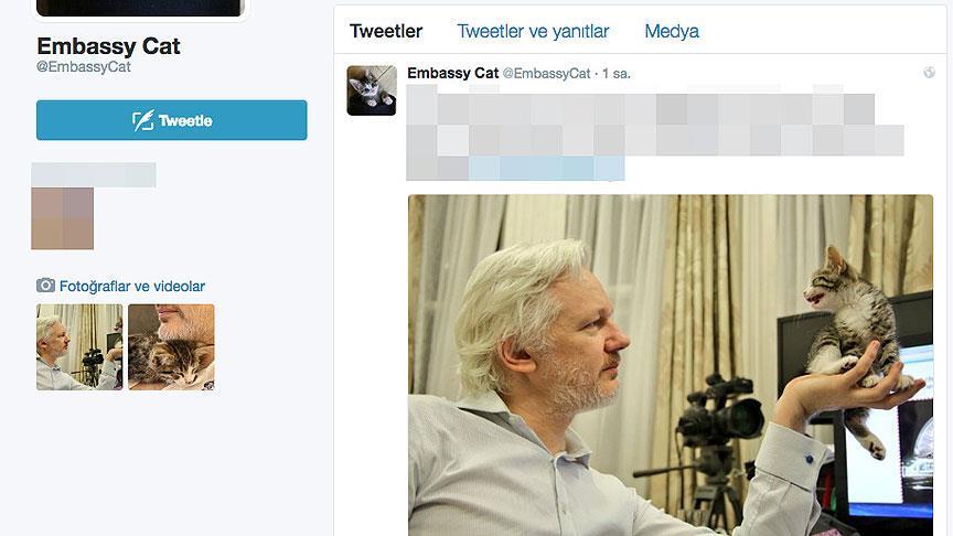 Assange'ın çocukları tarafından hediye edilen kedi için sosyal medya sitesi Twitter'da, EmbassyCat (elçilik kedisi) kullanıcı adlı bir profil oluşturuldu.