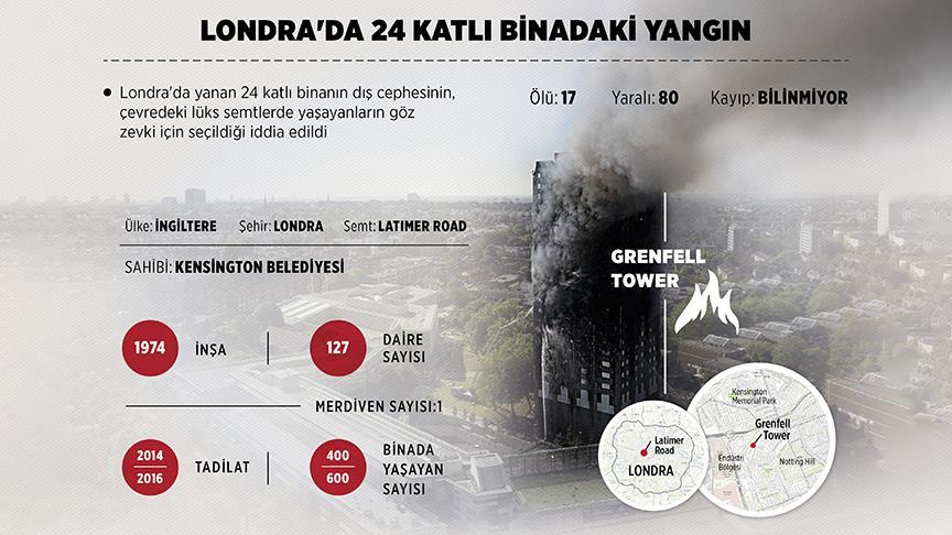 İlk 4 katı ofis ve ortak alanlardan oluşan Grenfell Tower’ın ikametgahlara ayrılan 20 katında 400 ila 600 kişinin yaşadığı tahmin ediliyor. Binadan kendi imkanlarıyla kaçanların yanı sıra itfaiyenin mahsur kalan 65 kişiyi kurtardığı bildirildi. Ancak kendisinden haber alınamayan çok sayıda bina sakininin kaderi halen belirsiz.