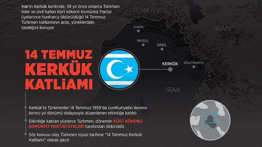 Kerkük'te 14 Temmuz 1959'da cumhuriyetin ilanının birinci yıl dönümü dolayısıyla düzenlenen etkinliğe katılan yüzlerce Türkmenin öldürülmesinin 59. yılında değerlendirmelerde bulunan Kerküklü Türkmen yetkililer ve o dönemin tanıkları, Türkmenler için acı bir hatıra bırakan bu katliamın amacının, bölgeden Türkmen varlığı ve lider kadrosunu yok etmek olduğunu anlattı.