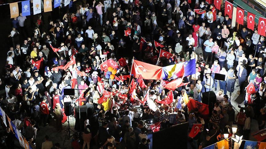 Burada şarkılar söyleyerek kutlama yapan vatandaşlar, Türk bayrağı ile AK Parti ve MHP flamaları salladı.