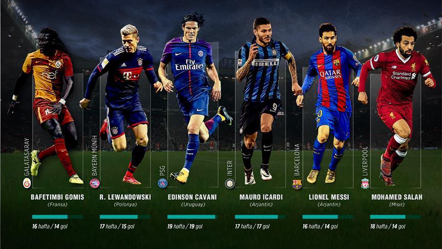 Almanya'da Robert Lewandowski, Fransa'da Edinson Cavani, İngiltere'de Mohamed Salah, İtalya'da Mauro Icardi, İspanya'da Lionel Messi ve Türkiye'de ise Bafetimbi Gomis gol krallığındaki yarışta zirvede yer alıyor.