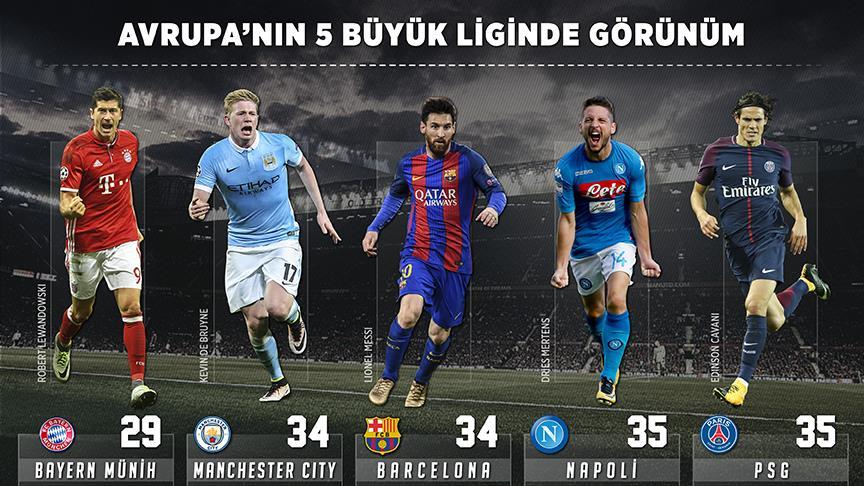 İngiltere'de Manchester City, İspanya'da Barcelona, Almanya'da Bayern Münih, İtalya'da Napoli, Fransa'da ise Paris Saint-Germain (PSG), puan tablosunun zirvesinde yer aldı.