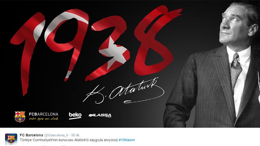 Milli futbolcu Arda Turan'ın forma giydiği İspanya Birinci Futbol Ligi (La Liga) takımlarından Barcelona, Büyük Önder Mustafa Kemal Atatürk'ün ebediyete intikalinin 78. yılı dolayısıyla mesaj paylaştı.