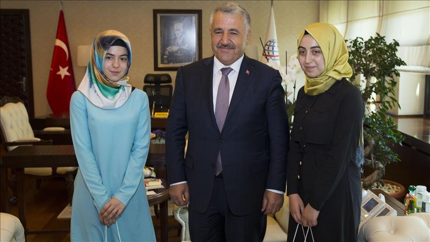Bakan Arslan, Lisans Yerleştirme Sınavı'nda (LYS) 500 tam puan alarak Türkiye birincisi olan Beyza Gürbüz ile Türkiye üçüncüsü Züleyha Seyhan'ı makamında kabul etti.
