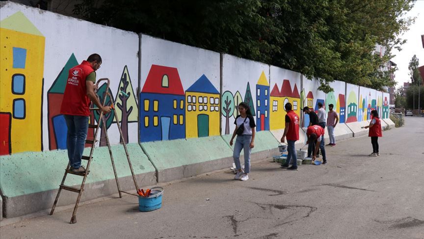 Ağrı Gençlik Merkezi, İl Emniyet Müdürlüğü ve Yeşilay Şubesi tarafından başlatılan "Sokağımı Güzelleştiriyorum" projesi kapsamında bir araya gelen gönüllü gençler, ellerine aldıkları boya ve fırçalarla terör eylemlerine karşı kentteki kurum ve kuruluşların etrafına kurulan beton bariyerleri renklendirdi.