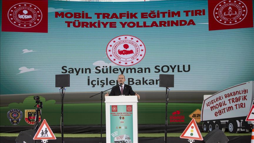 İçişleri Bakanı Süleyman Soylu, "Mobil Trafik Eğitim Tırı"nın Milli Eğitim Bakanlığı ile belirlenen program çerçevesinde Türkiye'yi dolaşacağını, eğitimlerle 81 ilde, 40 bin ilkokulda eğitim gören yaklaşık 6 milyon öğrenciye ulaşılacağını söyledi.