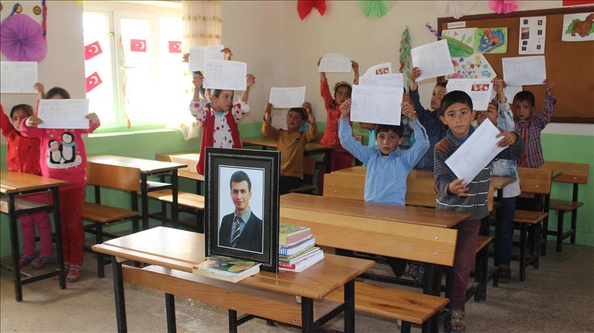 Öğrenciler karnelerini aldıktan sonra şehit öğretmenin masadaki fotoğrafını öptü.