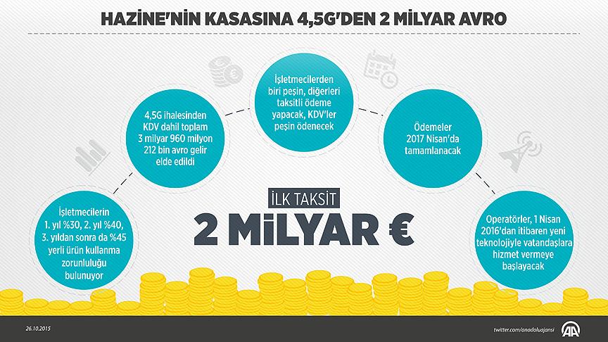 AA muhabirinin aldığı bilgiye göre, Ulaştırma, Denizcilik ve Haberleşme Bakanlığının belirlediği politika doğrultusunda Bilgi Teknolojileri ve İletişim Kurumu (BTK) tarafından, kamuoyunda 4,5G olarak bilinen IMT-Advanced yetkilendirmesine ilişkin 26 Ağustos’ta yapılan ihaleyi kazanan operatörler, toplam 2 milyar avro olan ilk ödemelerini bugün Hazine'ye yaptı.