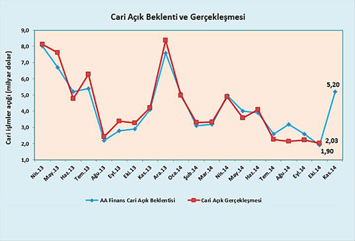 AA Finans "Cari İşlemler Açığı Beklenti Anketi"ne katılan ekonomistlerin, 2014 kasım ayı cari işlemler açığı beklentilerinin ortalaması 5,2 milyar dolar oldu.