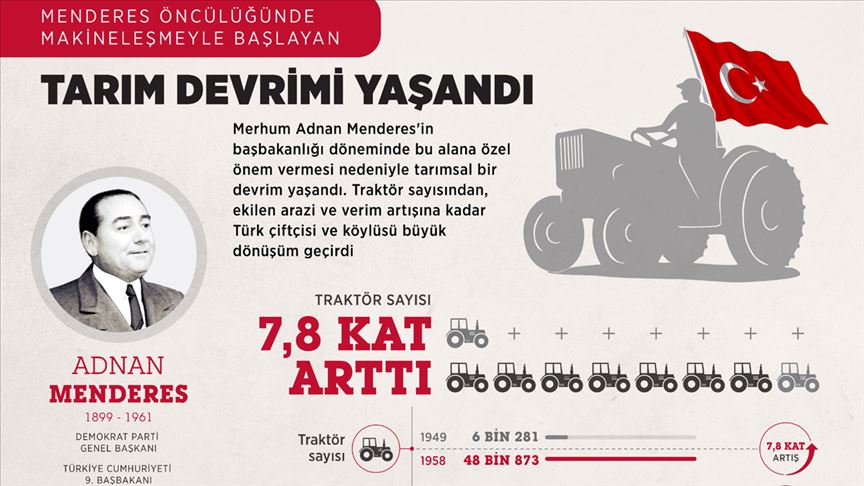 Merhum Adnan Menderes'in başbakanlığı döneminde atılan adımlarla tarım sektöründe büyük bir devrim yaşandı. Traktör sayısından ekilen arazi ve verim artışına kadar Türk çiftçisi ve köylüsü kapsamlı dönüşüm geçirdi.