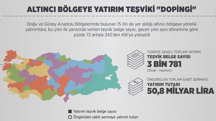 Doğu ve Güney Anadolu Bölgelerinde bulunan 15 ilin de yer aldığı altıncı bölgeye yönelik yatırımlara, bu yılın ilk yarısında verilen teşvik belgesi sayısı, geçen yılın aynı dönemine göre yüzde 72 artışla 242'den 416'ya yükseldi. Altıncı bölgeye yönelik yatırımlarda öngörülen sabit sermaye tutarı ise aynı dönemde yüzde 270 artarak 1,3 milyar liradan 4,9 milyar liraya ulaştı.