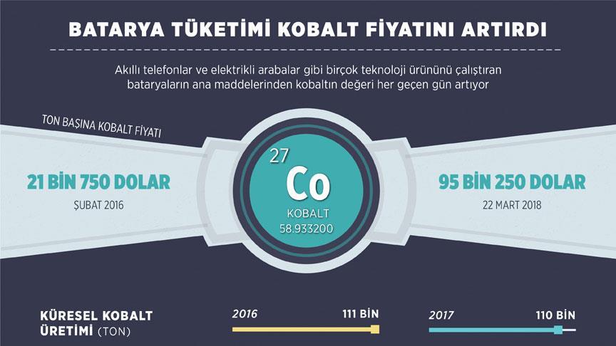 Elektrikli arabalar ve akıllı telefonlar başta olmak üzere birçok teknoloji ürününün bataryalarında kullanılan kobaltın fiyatı artıyor. Şubat 2016'da 21 bin 750 dolar olan madenin ton başına fiyatı, 22 Mart itibarıyla 95 bin 250 dolara ulaştı.