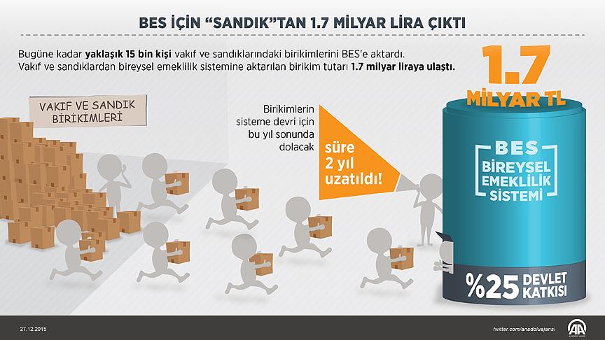 Ekonomiden Sorumlu Başbakan Yardımcısı Mehmet Şimşek, vakıf ve sandıklardan bireysel emeklilik sistemine (BES) aktarılan birikim tutarının 1,7 milyar liraya ulaştığını belirterek, bugüne kadar yaklaşık 15 bin kişinin vakıf ve sandıklarındaki birikimlerini BES'e devrettiğini bildirdi.
