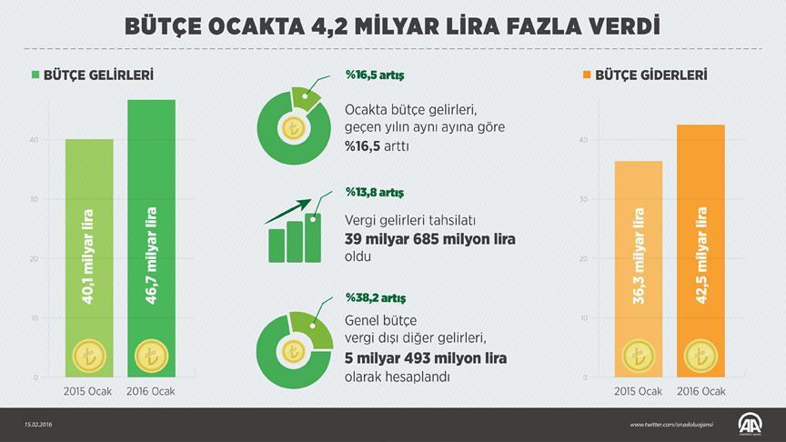Bütçe uygulama sonuçlarına ilişkin Maliye Bakanlığında yapılan açıklamada da ocakta bütçe gelirlerinin, geçen yılın aynı ayına göre yüzde 16,5 artarak 46,7 milyar liraya, bütçe giderlerinin ise yüzde 17 artış göstererek 42,5 milyar liraya çıktığı belirtildi.