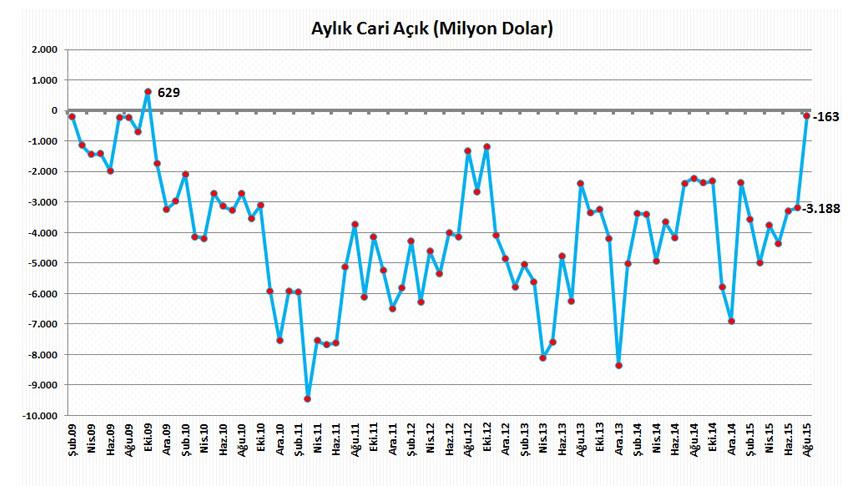 Türkiye'nin cari açığı ağustosta aylık bazda 163 milyon dolar ile yaklaşık 6 yılın en düşük seviyesinde gerçekleşti.