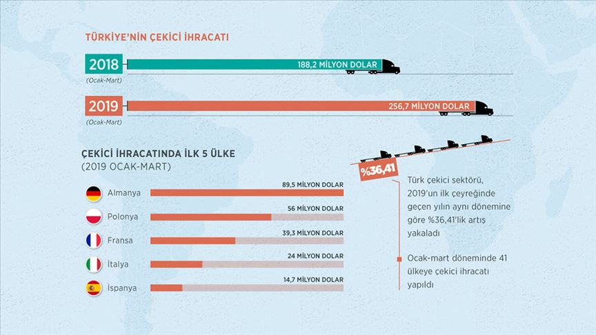 Çekici ihracatında bu yılın ilk çeyreğinde 2018'in aynı dönemine göre yüzde 36,41'lik artış sağlandı. Geçen yılın ilk üç ayında 188 milyon 158 bin dolarlık ihracat yapan sektör, bu yılın 3 ayında 256 milyon 667 bin dolarlık dış satım gerçekleştirdi.