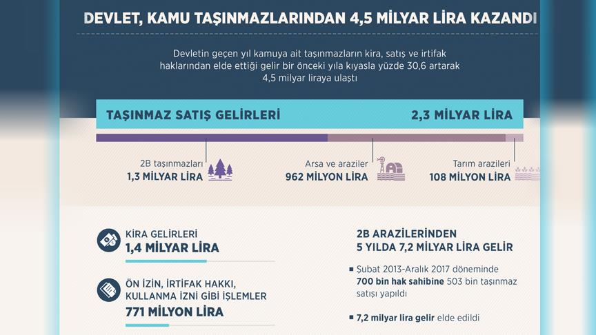 Milli Emlak Genel Müdürlüğü verilerine göre, geçen yıl, devlet, kamuya ait taşınmaz satışından 2 milyar 348 milyon 730 bin lira, taşınmaz kiralarından 1 milyar 395 milyon 308 bin lira, ön izin, irtifak hakkı, kullanma izni gibi işlemlerden de 771 milyon 721 bin lira olmak üzere toplam 4 milyar 515 milyon 759 bin lira kazanç sağladı. Söz konusu gelir 2016 yılında 3 milyar 457 milyon 635 bin lira düzeyindeydi.