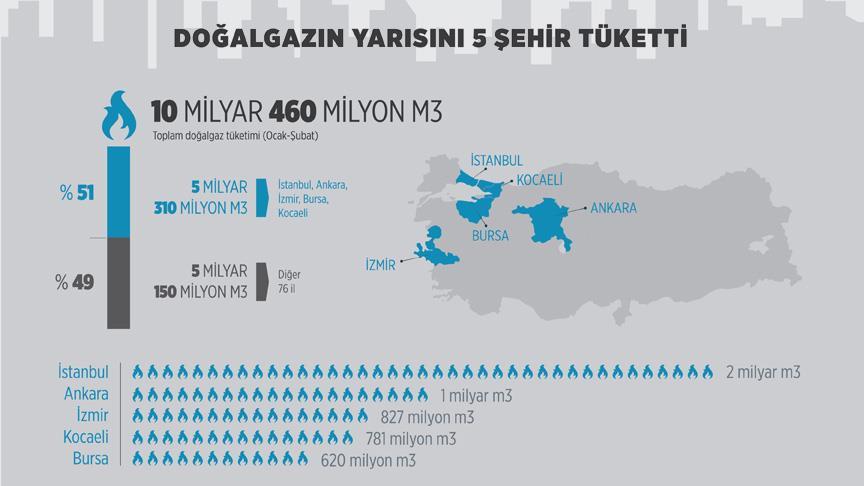 AA muhabirinin EPDK verilerinden derlediği bilgiye göre, Türkiye'de ocak ve şubat aylarında toplam 10 milyar 460 milyon metreküp doğalgaz tüketildi. En fazla doğalgaz tüketilen iller İstanbul, Ankara, İzmir, Bursa ve Kocaeli olarak sıralandı. Söz konusu 5 şehirde kullanılan doğalgaz miktarı, 5 milyar 310 milyon metreküple toplam tüketimin yaklaşık yüzde 51'ini oluşturdu.