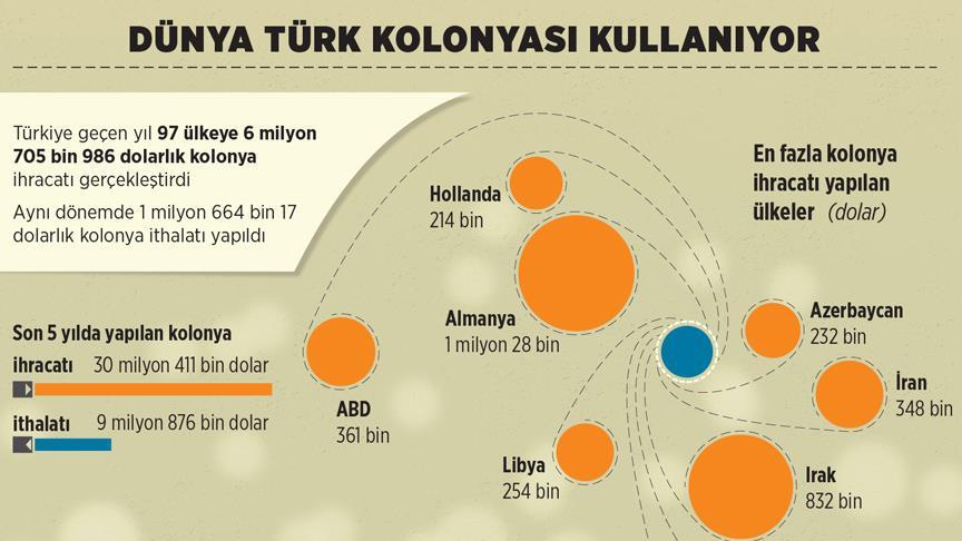 Son 5 yıldaki kolonya ihracatı ise 30 milyon 411 bin dolar oldu. Türkiye 2011 yılında 4 milyon 356 bin, 2012'de 6 milyon 270 bin, 2013'te 5 milyon 625 bin, 2014'te 7 milyon 452 bin, geçen yıl da 6 milyon 705 bin dolarlık kolonya ihracatı gerçekleştirdi. Kolonya ithalatı ise son 5 yılda 9 milyon 876 bin dolar olarak hesaplandı.