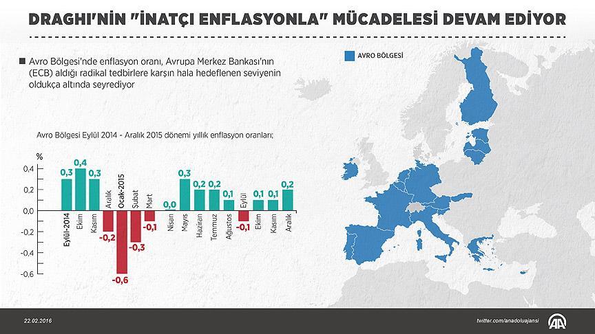 AA muhabirinin, Avrupa İstatistik Ofisinden (Eurostat) derlediği verilere göre, 19 üyeli Avro Bölgesi'nde, faiz indiriminin gerçekleştiği 2014 yılı Eylül ayında yüzde 0,3 artan yıllık enflasyon, ekim ayında yüzde 0,4 arttı. Kasım ayında da yüzde 0,3 yükselen yıllık enflasyon, aralıkta yüzde 0,2, 2015 yılının Ocak ayında yüzde 0,6, şubatta yüzde 0,3 ve parasal genişlemenin başladığı mart ayında ise yüzde 0,1 azaldı.