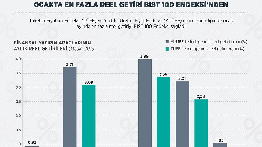 Tüketici Fiyatları Endeksi (TÜFE) ve Yurt İçi Üretici Fiyat Endeksi (Yİ-ÜFE) ile indirgendiğinde ocak ayında en fazla reel getiriyi BIST 100 Endeksi sağladı.