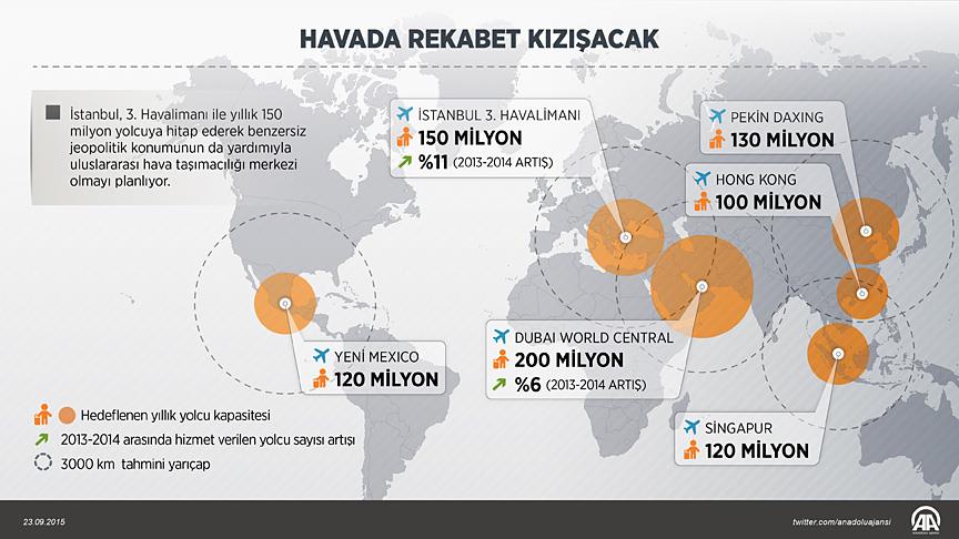 Uluslararası hava taşımacılığı pastasından aldıkları payı artırmak isteyen 6 büyük havalimanı, yeni yatırımlarla daha fazla rekabete hazırlanıyor. Yeni yatırımlarla en yüksek yolcu kapasitesi 200 milyon ile Dubai World Central - Al Maktoum Uluslararası Havalimanı'nda olacak, bunu 150 milyon yolcu kapasitesiyle İstanbul'da inşa edilecek yeni havalimanı izleyecek.