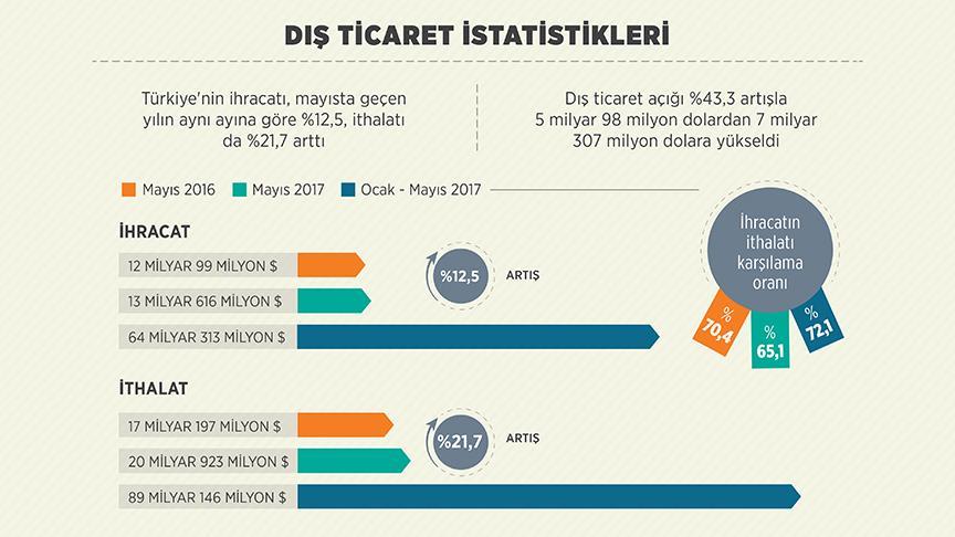 Türkiye'nin ihracatı, mayısta geçen yılın aynı ayına göre yüzde 12,5 artarak 13 milyar 616 milyon dolara, ithalatı ise yüzde 21,7 artışla 20 milyar 923 milyon dolara çıktı.