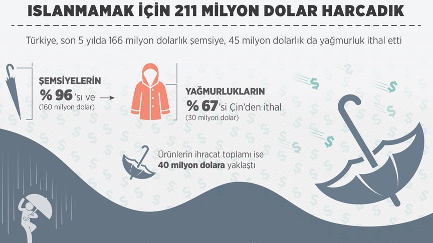 AA muhabirinin Türkiye İstatistik Kurumu (TÜİK) verilerinden derlediği bilgiye göre, Türkiye'de 5 yılda şemsiye ve yağmurluk ithalatı için harcanan tutar 211 milyon dolar oldu. Buna göre 2011'de 43,3 milyon dolarlık şemsiye ithal edilirken, bu rakam 2012'de 28,9 milyon dolar, 2013'te 30,2 milyon dolar, 2014'te 28,1 milyon dolar 2015'te ise 35 milyon 458 bin dolar olarak hesaplandı.