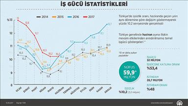 Söz konusu ayda 15-24 yaş grubunu içeren genç işsizlik oranı 3,7 puanlık azalışla yüzde 17,7'ye geriledi. İşsizlik oranı, 15-64 yaş grubunda da 1,7 puan azalarak yüzde 10,3 olarak gerçekleşti.