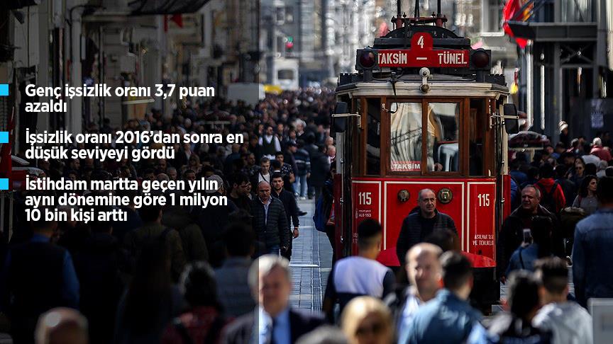 Buna göre, martta yüzde 10,1'e gerileyen işsizlik oranı, böylece Mayıs 2016'dan sonra en düşük seviyeyi gördü. İşsizlik oranı, Mayıs 2016'da yüzde 9,4 seviyesinde gerçekleşmişti.