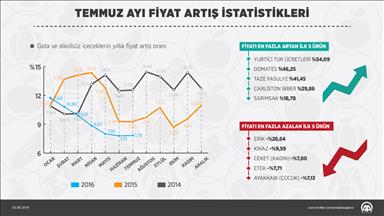 Ağustos ayında 15 maddenin fiyatında ise azalış görüldü. Gıda harcamaları grubunda yer alan ve mevsimsel özelliklere bağlı olarak ürün fazlalığı yaşanan yaş üzüm yüzde 22,08'lik indirimle, ağustos ayında fiyatı en fazla azalış gösteren madde oldu.