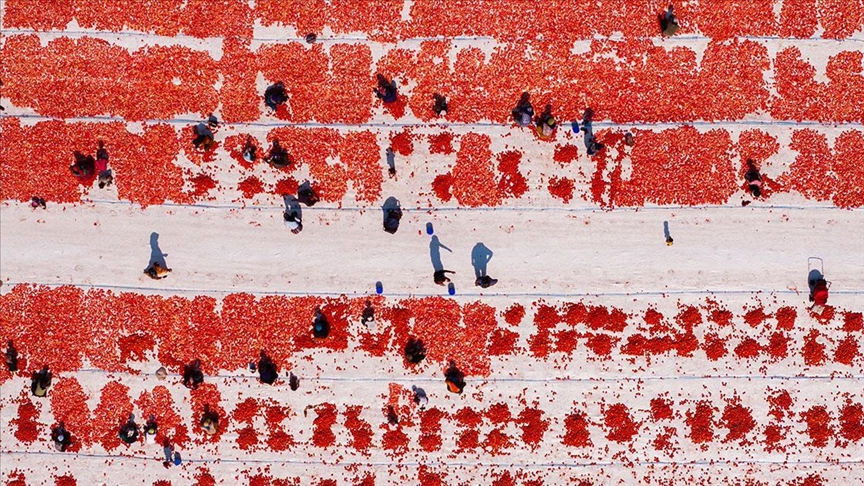 AA Canlı Tarım işçileri tarafından ikiye bölünerek örtülerin üzerine sıralanan domatesler, müşteri talebine göre kükürtlü veya tuzlu olarak 1 hafta güneş altında bekletilerek kurutuluyor.