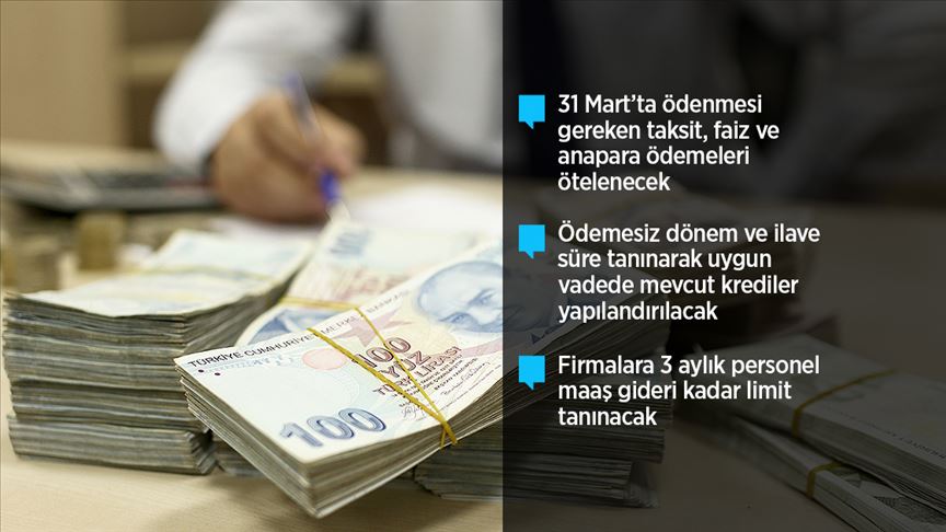 Kredi vadelerinin ertelenmesinden mevcut kredilerin yeniden yapılandırılmasına kadar pek çok maddeyi barındıran paket kapsamında, firmaların, 31 Mart devre sonu faizleri de dahil olmak üzere 30 Haziran’a kadarki tüm kredi taksitleri ve ödemeleri konusunda esneklik sağlanacak.
