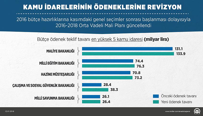 Yeni Orta Vadeli Mali Plan'a göre, 2016 bütçesi ödenek teklifi tavanları en çok artırılan kamu idareleri, Gençlik ve Spor Bakanlığı, Enerji ve Tabii Kaynaklar Bakanlığı ile Çalışma ve Sosyal Güvenlik Bakanlığı oldu.