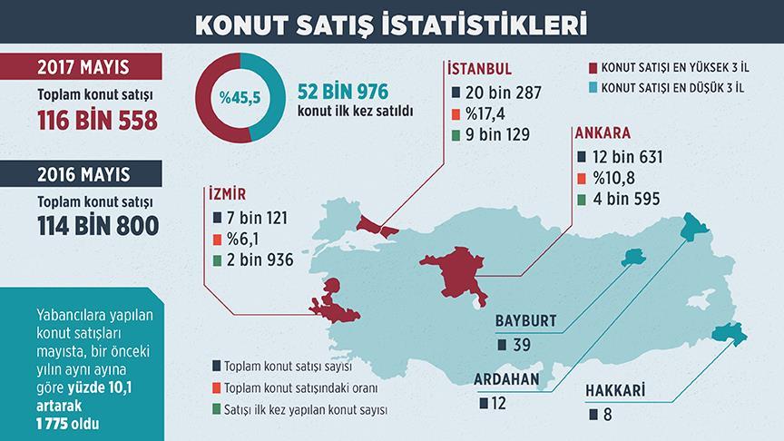 Buna göre, ülke genelinde mayısta satılan konut sayısı, bir önceki aya göre yüzde 1,8 yükseldi. Konut sayısı geçen yılın aynı ayına göre ise yüzde 1,5 artarak 116 bin 558 oldu.