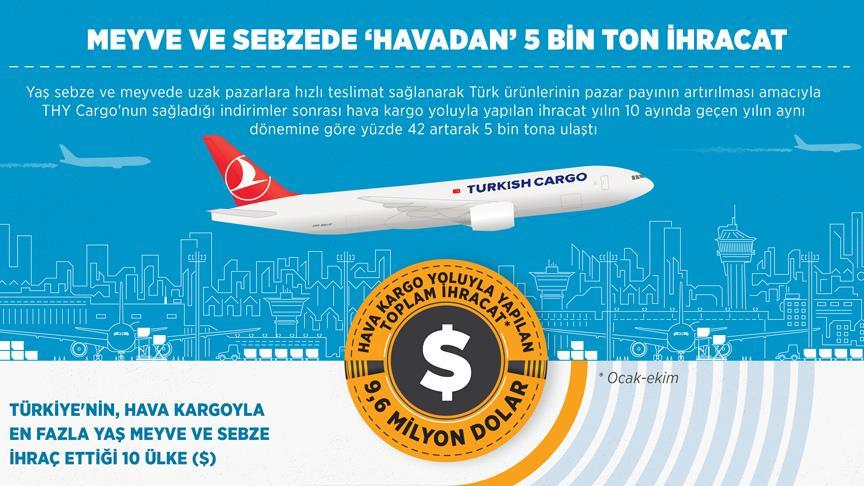 Yaş meyve ve sebze ihracatçılarının "özel indirim ve yeni destinasyonlara uçulması" konusunda Türk Hava Yolları'nın (THY) kargo şirketi Turkish Cargo ile mayıs ayında yaptığı anlaşma sonrası, bu ürünlerin ihracatında artış yaşandı.