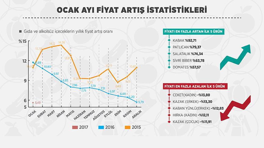 Tüketici fiyatları bazında ocakta en yüksek fiyat artışı, yüzde 92,71 ile kabakta oldu.
