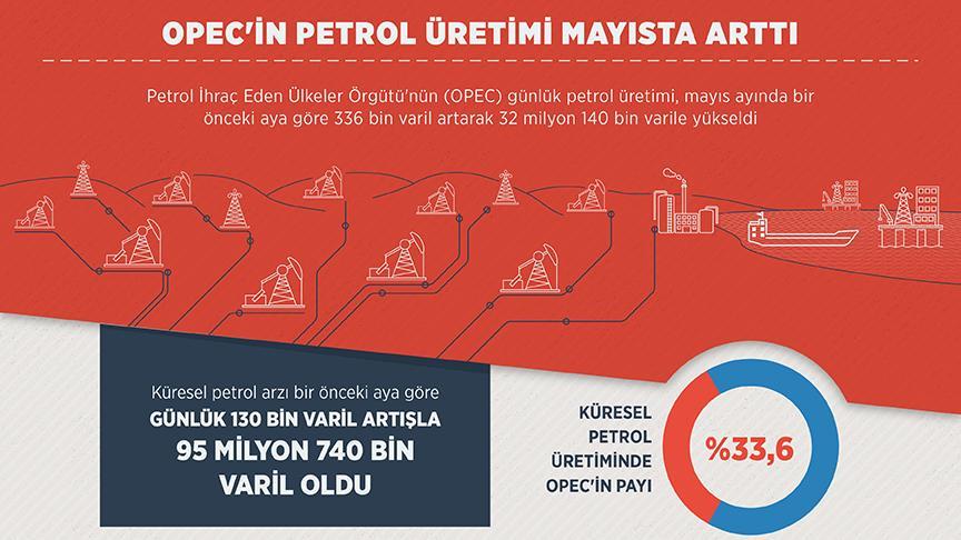 OPEC'in ham petrol üretimi mayısta bir önceki aya göre günlük 336 bin varil artarak 32 milyon 140 bin varil oldu. OPEC'in üretimini artırmasıyla mayısta küresel petrol üretimindeki payı yüzde 33,6 oldu.