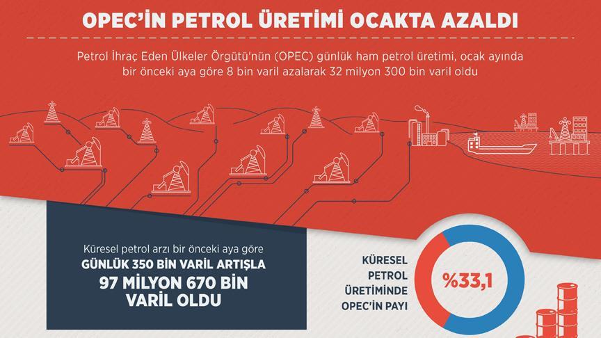 Söz konusu ayda OPEC'in ham petrol üretimi ise günlük 8 bin varil azalarak 32 milyon 300 bin varile düştü. Ocakta OPEC'in üretimini kısmasıyla küresel petrol üretimi içindeki payı da yüzde 33,1 oldu.