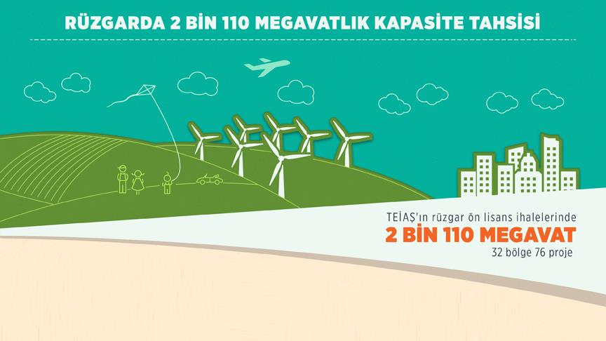 TEİAŞ'ın rüzgar ön lisans ihalelerinde 32 bölge için 76 projeye toplam 2 bin 110 megavatlık kapasite tahsisi yapıldı.