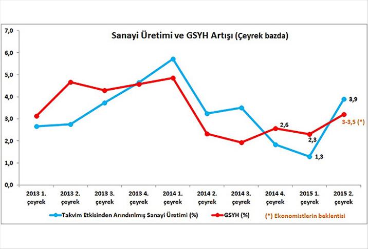 Türkiye'de sanayi üretimi ile milli gelir verileri arasındaki yakın ilişki dikkate alındığında, bu görünümün ikinci çeyrekte ilk çeyrekten daha güçlü bir GSYH artışına işaret ettiğini ifade eden Bürümcekçi, "Haziran ayı sanayi üretimi, büyümenin ikinci çeyrek için yüzde 2,5-3 aralığında olan ön tahminimizin üzerinde yüzde 3,5 civarında gerçekleşebileceğini düşündürdü. İkinci çeyrekte yüzde 3,5 civarı bir büyüme kaydedilebileceğini, 2015 yılı büyüme tahminimiz olan yüzde 2,9 üzerinde risklerin ise dengeli olduğunu öngörmekteyiz" dedi.