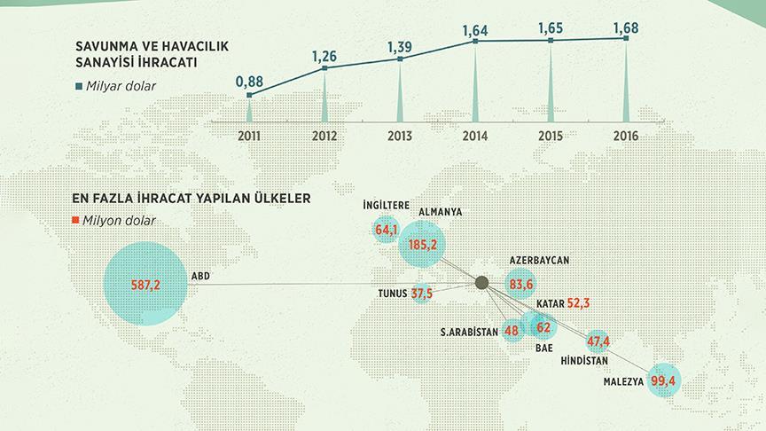 Türkiye İhracatçılar Meclisinin geçici ihracat verilerine göre, savunma ve havacılık sektörünün geçen yılki ihracatı bir önceki yıla göre yüzde 1,4 arttı. Böylece 2015'te 1 milyar 654 milyon 88 bin dolar olan savunma ve havacılık sanayisi ihracatı, 1 milyar 677 milyon 513 bin dolara çıktı.