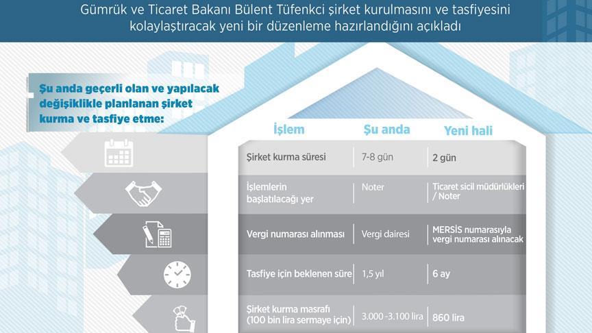 Gümrük ve Ticaret Bakanı Bülent Tüfenkci, şirketlerin kurulması ve tasfiyesini kolaylaştıracak yeni bir düzenleme hazırlandığını söyledi.