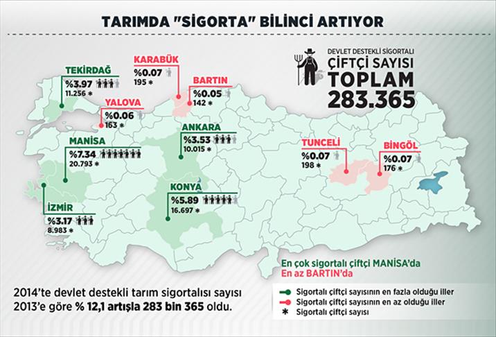 Tarımda sigorta bilincinin her geçen yıl arttığı Türkiye'de, devlet destekli tarım sigortalısı sayısı 2014'te 283 bin 365'e, sigortalı tarım alanı 16,1 milyon dekara, hayvan sayısı da 1 milyona ulaştı.