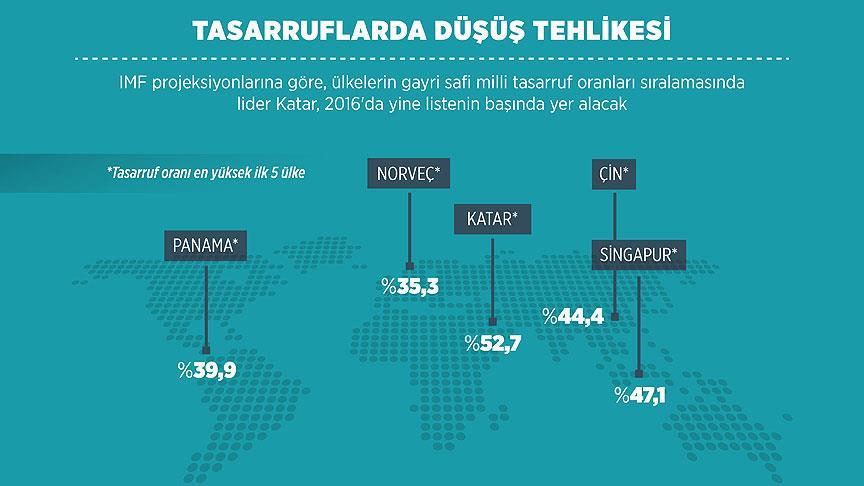 Uluslararası Para Fonu (IMF) projeksiyonlarına göre, dünya tasarruf sıralamasında ilk sıralarda yer alan petrol zengini ülkelerin enerji gelirlerindeki düşüşe paralel, 2016'da gayri safi tasarruf oranları da düşüş gösterecek. Türkiye ise gelecek 5 yıllık süreçte yüzde 15'lik tasarruf oranları ile bir anlamda yerinde sayacak.
