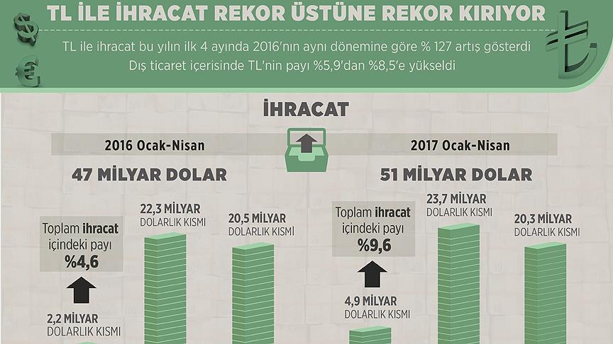 Geçen yılın ocak-nisan döneminde yüzde 4,6 olan toplam ihracat içinde TL'nin payı, 2017'nin aynı döneminde yüzde 9,6'ya ulaştı.