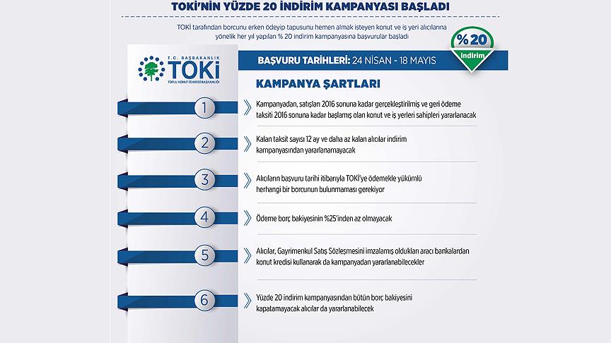 Tapularını hemen almak isteyen kişilerin kampanyaya gösterdikleri ilgiden memnuniyet duyduklarını kaydeden Turan, "TOKİ'den sosyal konut satın alan, çoğu alt gelir grubundan vatandaşlarımıza yüzde 20 erken ödeme indirimi ile önemli bir fırsat sunduk. 100 bin lira borcu olan bir vatandaşımızın 18 Mayıs'a kadar borcunu kapatması halinde, 80 bin lira ödeyeceğini belirttik. Kampanyamız ilk gün oldukça ilgi gördü ve ilk 409 vatandaşımız 19 milyon 778 TL'lik borçlarını kapatıp tapularını aldı." ifadelerini kullandı.